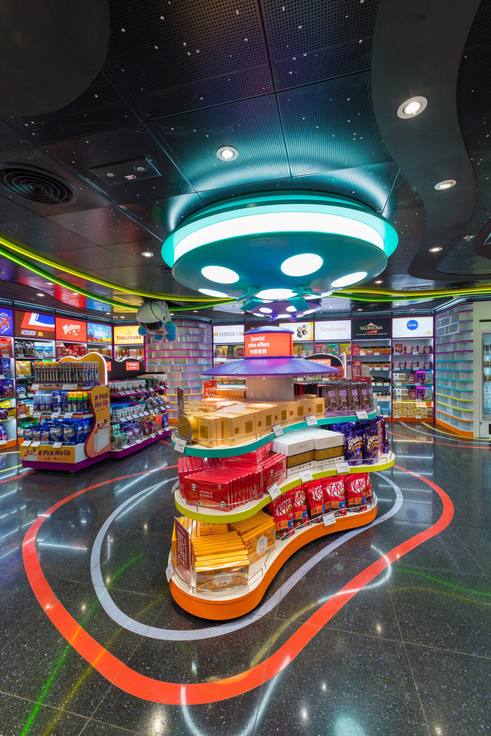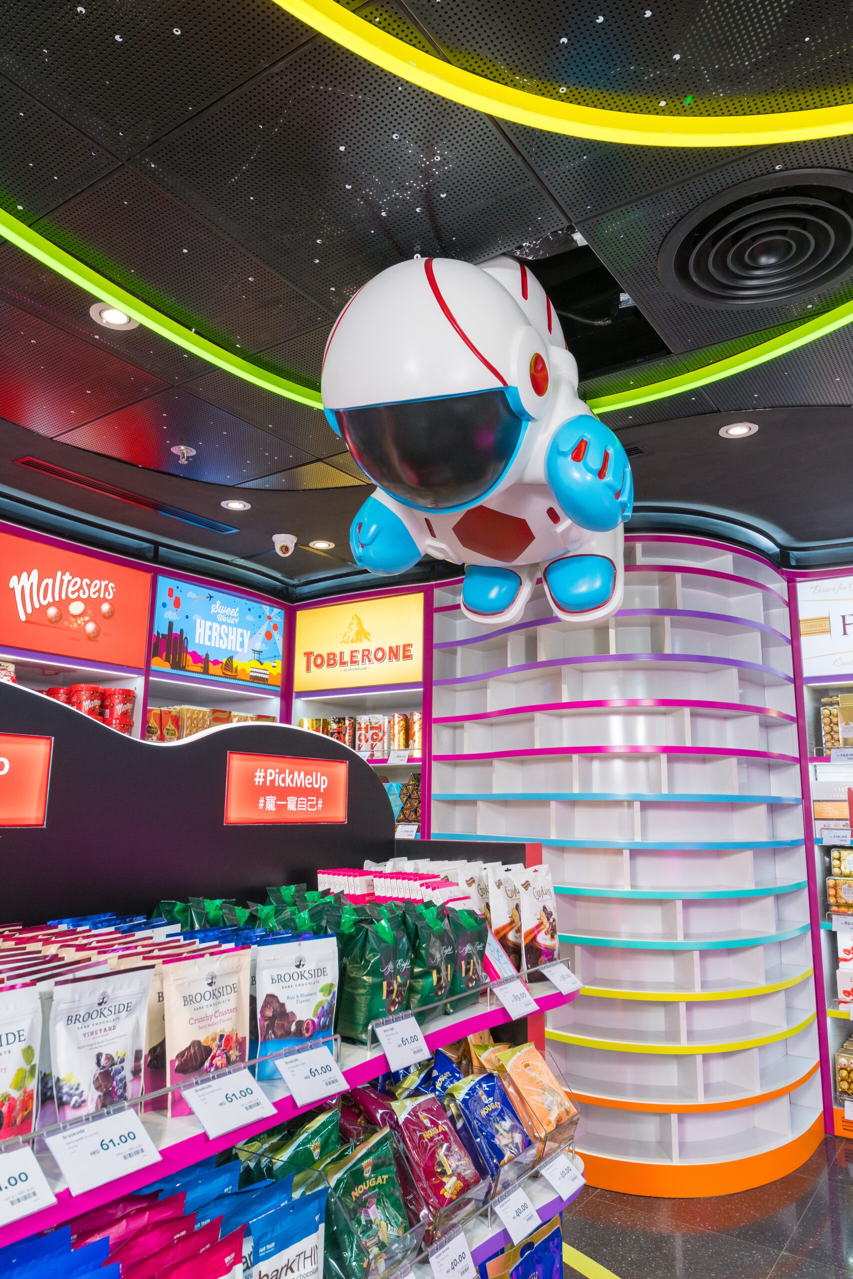 The distinctive concept of each store layout was crafted to precision when outlines were cut out from laser methodology to create its intriguing shapes. With attractive lighted ceilings and displays from a spaceman to a hot air balloon suspended from the ceiling, each store retains its quirky characteristic.